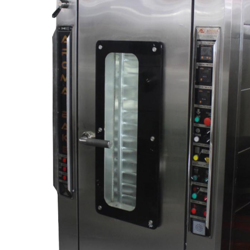 The 42 Tray Gas Rotary Oven is designed for commercial bakeries seeking efficient bulk production with consistent results. Built with a Riello gas burner, Crompton motor, and Schneider electrical components, this oven ensures reliable performance and energy savings. Its stainless steel chamber and durable insulation provide uniform baking for bread, biscuits, buns, and rusk.